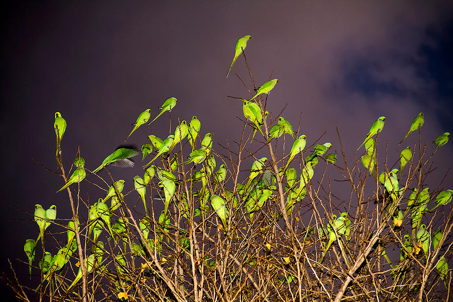 当下的东京见证着日本的繁荣与虚空,城市轮廓日异更替,殊不知在东京凝视万物新陈代谢的背后还有这样一群鹦鹉在黑夜中窥视东京,待城市落幕之后,成群盘桓于东京的上空。我们通过水谷的影像关注着这群鹦鹉,就像它们窥视城市里的人类一样……